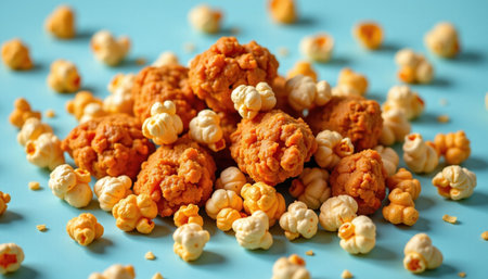 A fried chicken popcorn scattered artistically on blue background, creating delightful and appetizing scene
