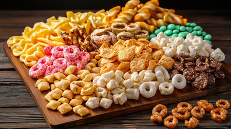 A visually appealing assortment of various snacks, including pretzels, chips, cheese, and chocolate treats, perfect for sharing or personal enjoyment.