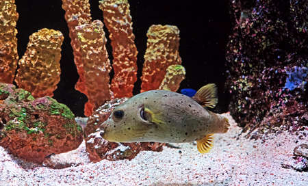 Yellow balloon fish inflated in a marine aquarium. Tropical fish in a coral reef