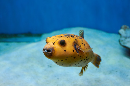 Porcupine pufferfish at the aquarium on the blue background. Marine fish concept Ichthyology concept