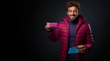 Young handsome hispanic man with curly hair wearing winter jacket against black background show card.