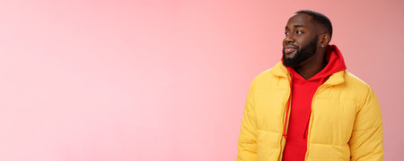Dreamy happy optimistic black bearded man looking left daydreaming recalling nice moments, enjoying warm peaceful weather walking park feel calm relieved, standing pink background smiling cute