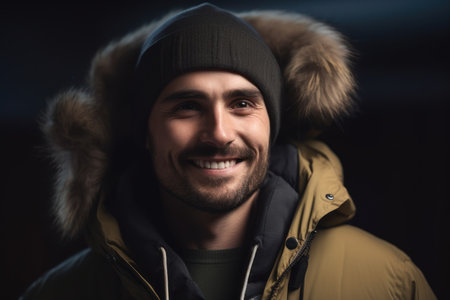 Portrait of a handsome young man in a warm jacket on a dark background.