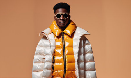 Headshot of serious young African American male model dressed in stylish orange winter jacket over white tshirt posing isolated at blank studio wall People style fashion : Generative AI