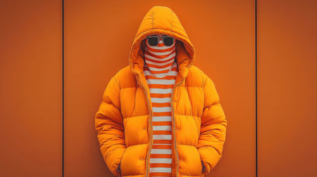 A vibrant fashion portrait showcasing a woman in an orange puffer jacket, stylish sunglasses, and a cozy knit headband set against a colorful urban backdrop.