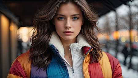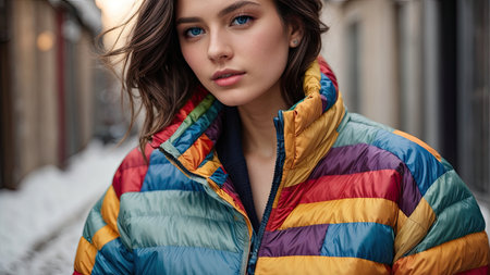 Close-up portrait of a beautiful young brunette woman in a colorful jacket in the city