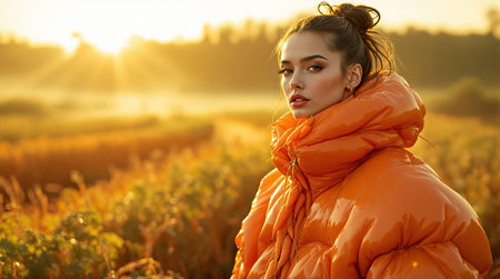 Woman in orange jacket enjoying golden hour in autumn field.