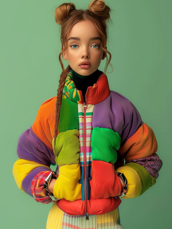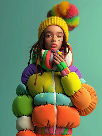 Trendy winter fashion with a colorful puffer jacket paired with warm gloves, blending style and comfort for cold weather.