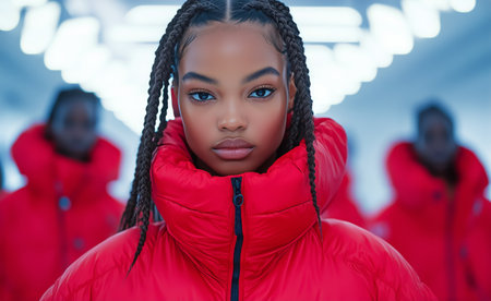 A young model with braided hair elegantly wears a bright red puffer jacket, standing confidently in front of a group. The colorful background features soft glowing lights.