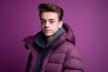 Portrait of a handsome young man in a winter jacket on a purple background
