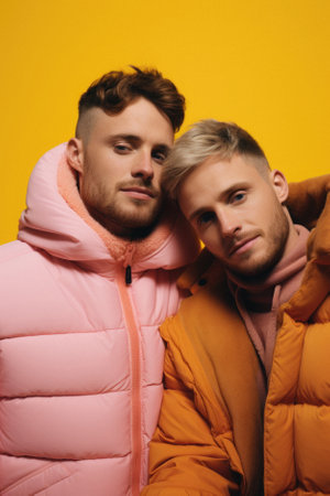 Young men in winter jackets looking at camera isolated on yellow, fashion concept.