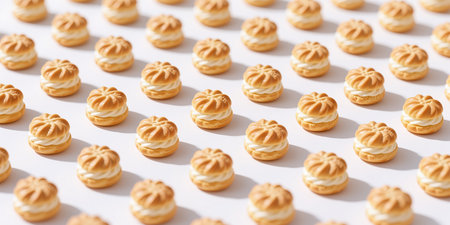 A pattern of cream-filled pastries with golden-brown tops and white filling, scattered randomly on a white background.