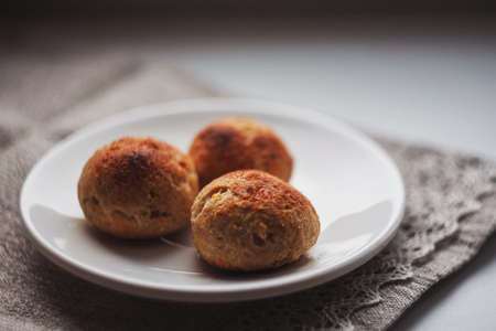 Three little cottage cheese buns freshly baked on a small white plate on top of lace decorated linen napkin