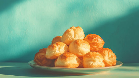 Delicious tower of gougères on plate against vibrant turquoise background for culinary delight