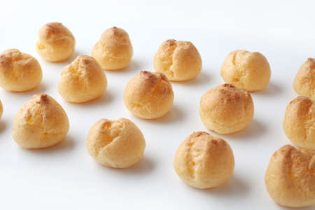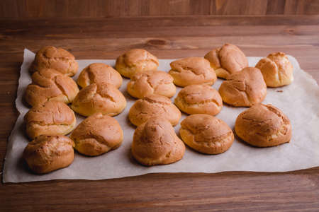 Choux pastry on a wooden background. Photographed in high key, closeup.