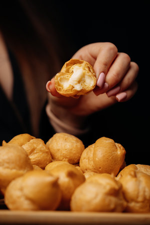 Cream puff pastry with cream on a wooden plate. Close-up.