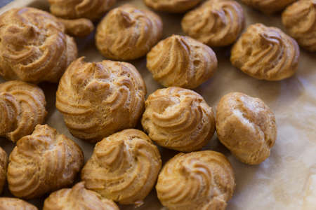 Heap of Fresh Baked French Choux Pastry Balls During Cooling Dawn before Cream Filled