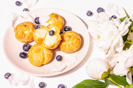Profiteroles with blueberries. Custard cakes, Eclair, cream puff. Modern hard light, dark shadow. White peonies on plaster background, place for text