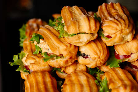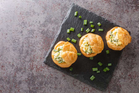 Snacks Profiteroles stuffed with egg salad close-up on a slate board on the table. horizontal top view from above