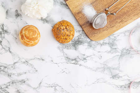 Homemade profitroles pastry filled with custard. Eclairs with cream, French dessert and flowers on marble table