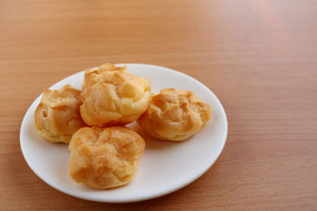Cream puffs or eclair or choux cream with vanilla custard on wooden table on white plate put on wood table, eat to tea and coffee with cocoa cold, copy space