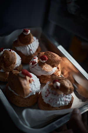 Close up of delicious profiteroles on baking tray. High quality photo