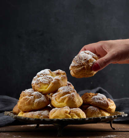 Baked eclairs with custard cream on a metal round plate sprinkled with powdered sugar