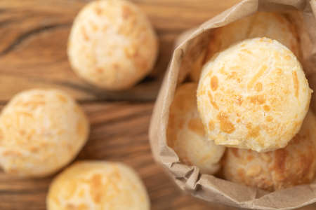 Typical brazilian cheese buns in a paper bag over wooden table.