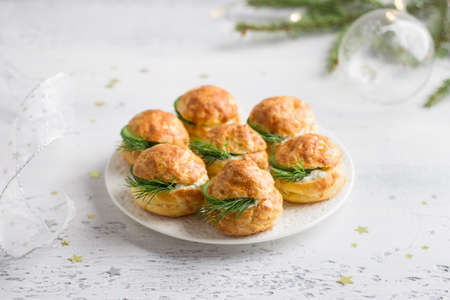 Cheese profiteroles with cream cheese, cucumber and herbs, gougeres, traditional French pastries, in a white plate on a light gray background, top view. Delicious snack for New Year's table or buffet