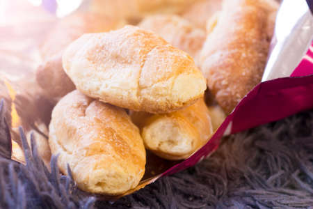 Puffs on light wooden board. Baked products under sunlight. Pastry of airy dough. Warm and delicious snack.