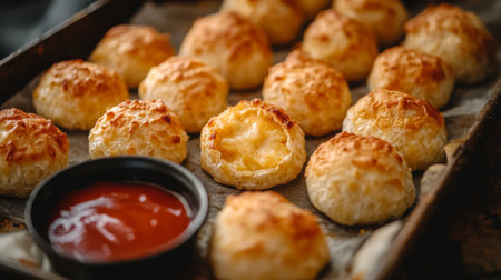 A tempting array of freshly baked cheesy pastry balls on a baking tray, served with dipping sauce. Perfect for parties and casual dining occasions.