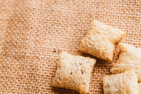 cereal pillows with chocolate filling on sackcloth background.