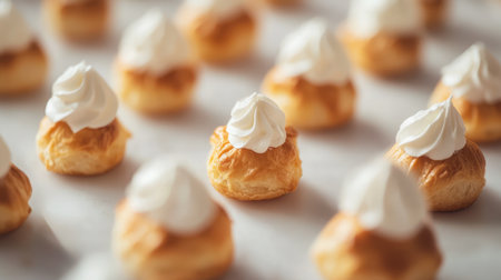Neatly arranged coconut cream puffs with golden pastry crust and whipped coconut cream swirl tops