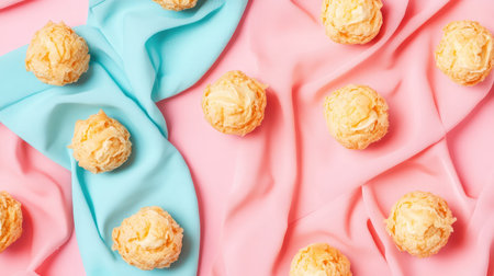 Perfectly shaped coconut cream puffs laid out in rows with pastel napkins folded beside
