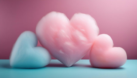 Pink and blue heart-shaped candy floss on a blue background