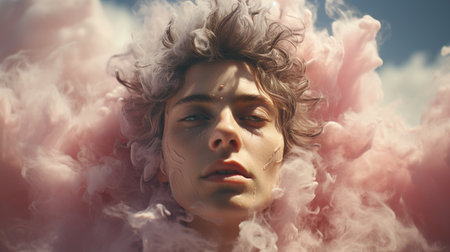 A young woman stands still her eyes covered by fluffy clouds against a pink background creating a dreamlike feel.