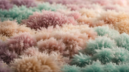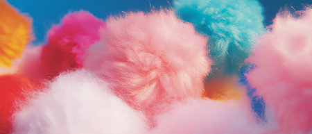 Colorful yarn pom-poms with fluffy textures in various shades create playful visual appeal