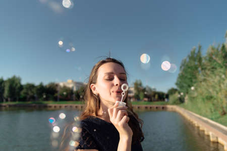 Gorgeous young brunette girl blowing soap bubbles in sunlit park.
