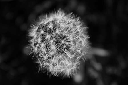 A black-and-white image of a white fluffy light dandelion flower growing in a meadow among dark grass. Nature.