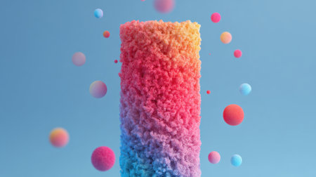 A tall, fluffy structure displays a gradient of colors from pink to purple. Small, vivid spheres float around it, creating a playful and dreamy atmosphere under a clear blue sky.