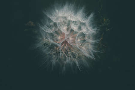 close up macro showing the soft, fragile, delicate white petals and flower grouping on a dandelion in a typical family garden