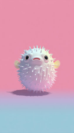 A charming illustration of a pufferfish with a spiky exterior, set against a gradient backdrop of pink and blue.