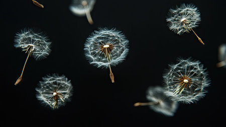 Elegant composition of several dandelion seeds floating on black, with soft light glow, symbolizing freedom, new beginnings, and lightness