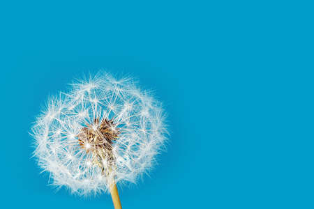 Dandelion flower head. White dandelion on blue background. Macro photo. Detail of plant.