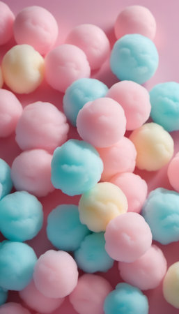 A pile of assorted pastel colored candies, including candies in pink, blue, yellow, and green hues, is displayed on a bright pink background. The candies are a mix of shapes and sizes, creating a vibrant and playful scene.