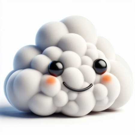 Kawaii cloud plushie with a sweet smiling face, surrounded by fluffy cotton-like clouds and dreamy candy-colored light