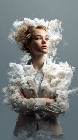 A surreal portrait depicts a woman whose head is physical obscured by a cloud, blending form with abstract emotion in a minimalist studio setting.
