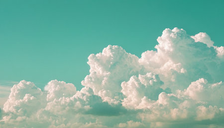 Dreamy, luminous cumulus clouds drift across a serene, bright blue sky