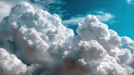 A stunning display of fluffy clouds fills the sky, showing intricate shapes and a rich texture. The vibrant blue backdrop emphasizes the brightness of the day, creating a sense of tranquility and beauty in the atmosphere.