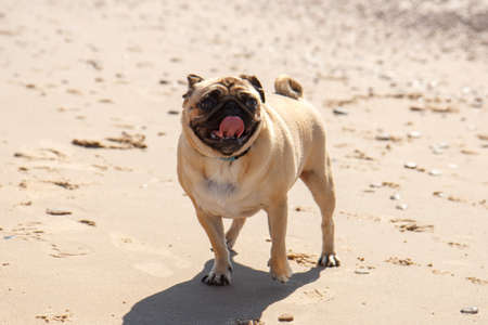 Pug dog portrait on nature background. Dog sitting on beach feeling fun vacations on the beach, vacations Concept
